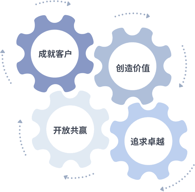 成就客户是一切决策的出发点,,,创造价值是衡量所有工作的标准,,,,追求卓越是我们做事做人的态度,,,,开放共赢是我们的格局也是最终的结果。。。价值观的齿轮环环相扣,,,推动着组织里的每个人不断向前。。。。